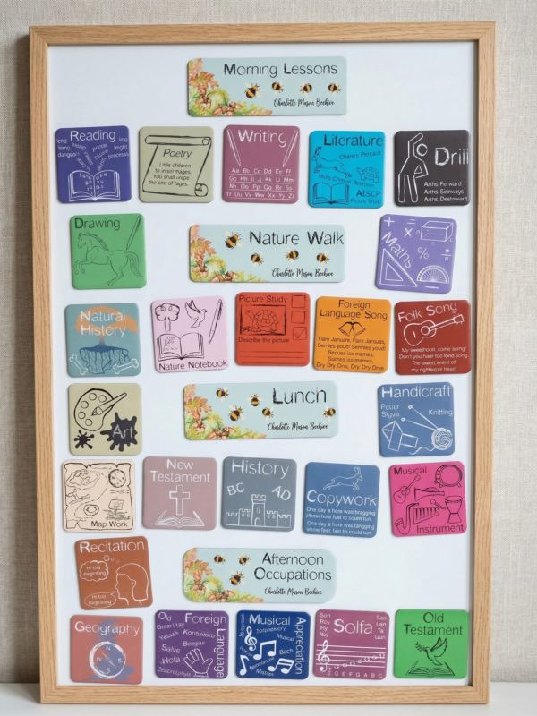 The subjects included are as follows: Drawing, Foreign Language, Geography, Musical Appreciation, Maths, Literature, Natural History, Art, Old Testament, New Testament, Recitation, Picture Study, Writing, Handicraft, Poetry, History, Copywork, Reading, Folk Song, Drill, Nature Notebook, Solfa, Musical Instrument, and Foreign Language Song.